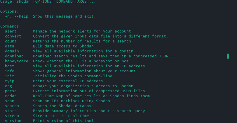 La interfaz de línea de comandos (CLI) de shodan está empaquetada con la librería oficial de Python para Shodan, lo que significa que si estás ejecutando la última versión de la librería, deberías tener acceso a la consola.