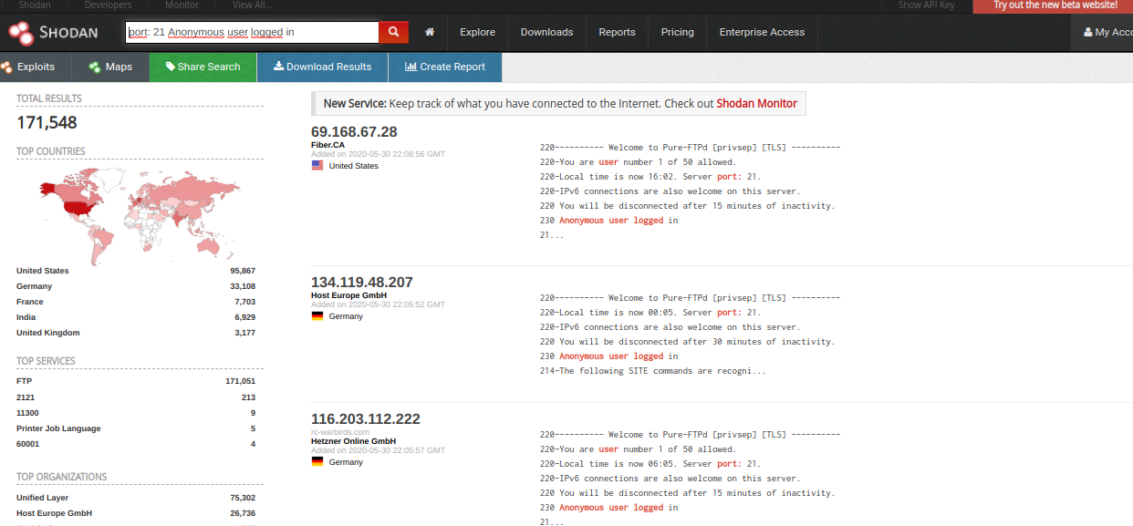 Shodan permite realizar una búsqueda de servidores que tengan un acceso FTP con usuario anónimo y se pueda acceder sin usuario y password.