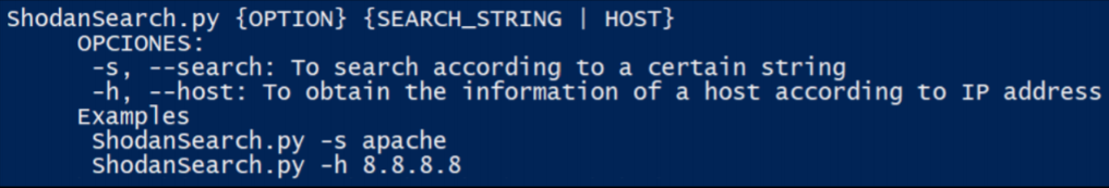 Al añadir el método anterior, nuestro script de ShodanSearch.py aceptaría por parámetro una cadena de búsqueda y la dirección IP del host: