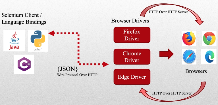 - El driver del navegador ejecuta los comandos en su respectivo navegador mediante HTTP.