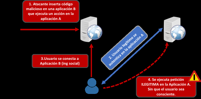 La vulnerabilidad de CSRF, conocida como falsificación de petición en sitios cruzados, consiste en engañar a un usuario legítimo (que esté identificado en la aplicación) para que ejecute peticiones/acciones sin su consentimiento (no sabe que esas peticiones se están realizando desde su usuario).