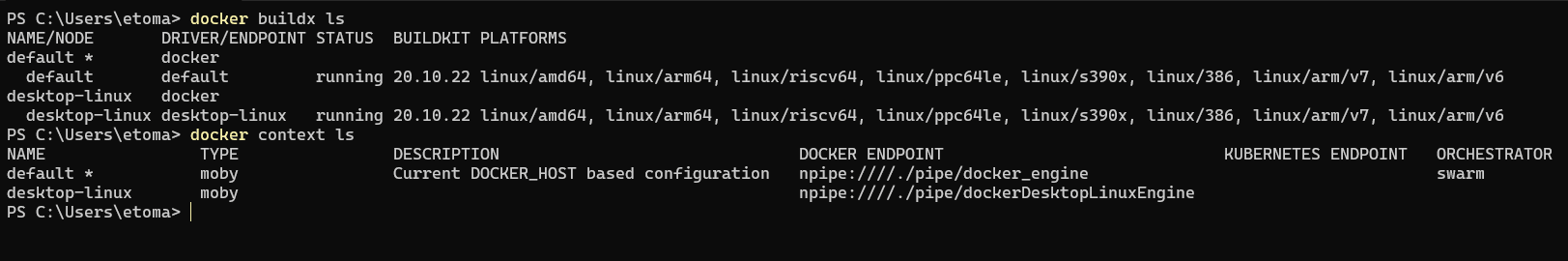 En la imagen anterior se puede ver como hay dos contextos de Docker (default y desktop-linux) y por lo tanto dos builders de docker buildx con los mismos nombres.