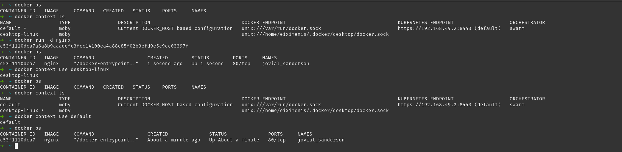 Este es el uso general de los contextos: vamos cambiando entre ellos usando docker context use y todas las acciones de la CLI afectarán siempre al contexto contra el que estemos conectados.