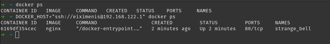En el primer comando lanzo un docker ps y eso se ejecuta contra el daemon de mi máquina local. Luego en el segundo comando establezco la variable DOCKER_HOST y me conecto al daemon de la máquina 192.168.122.1.
