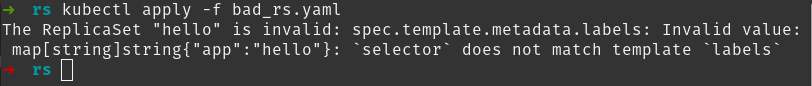 El mensaje de error es un poco confuso, pero básicamente nos dice que el valor de spec.template.metadata.labels (que es app: hello) no se corresponde con el valor del selector (el mensaje no nos dice cuál es).