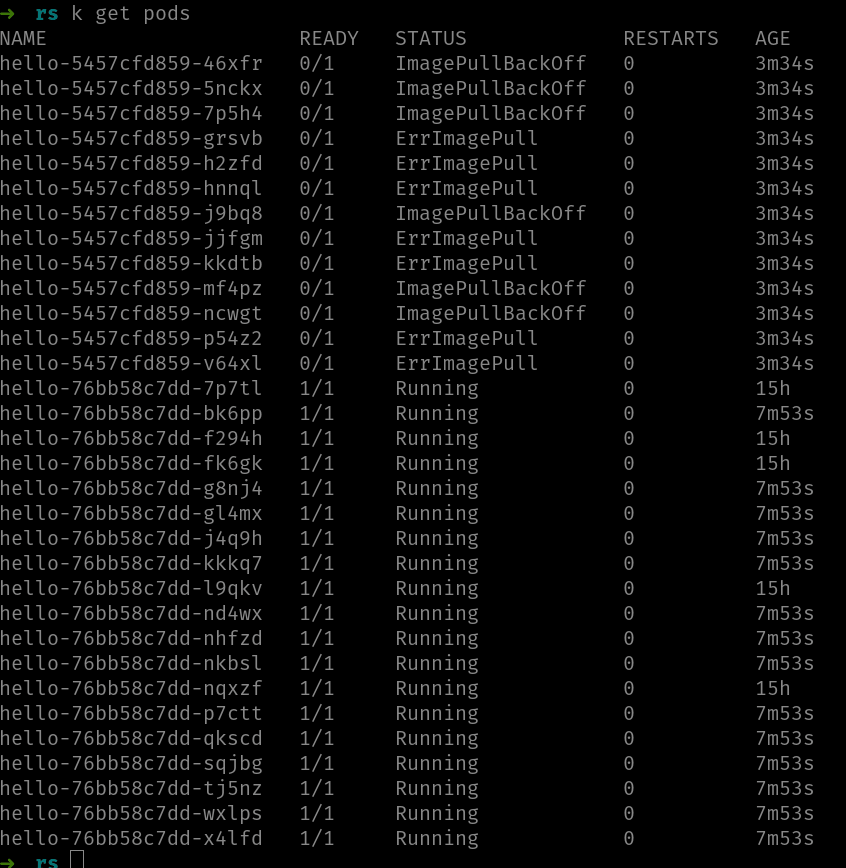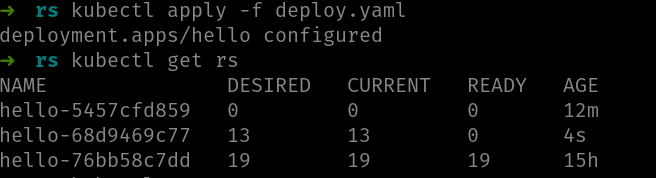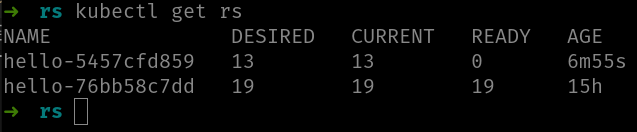 Observa cómo deployment ha configurado el ReplicaSet nuevo (hello-5457cfd859) para que tenga 13 instancias. Y actualmente ReplicaSet tiene esas 13, pero aquí la clave es la columna READY, que indica 0. Eso significa que no hay ninguna réplica que esté ejecutando el contenedor.