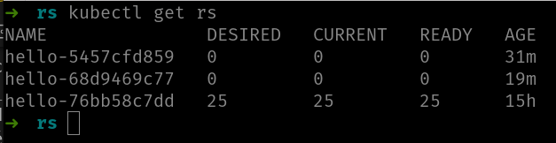 Observa como ahora es el ReplicaSet hello-76bb58c7dd el que tiene los 25 pods y todos ellos corriendo. Si miras las imágenes anteriores este es el ReplicaSet original. Hemos vuelto a la primera versión. También puedes ver que los otros ReplicaSets no son destruidos, es decir, podríamos volver a ellos si quisiéramos.