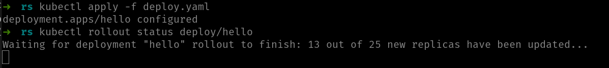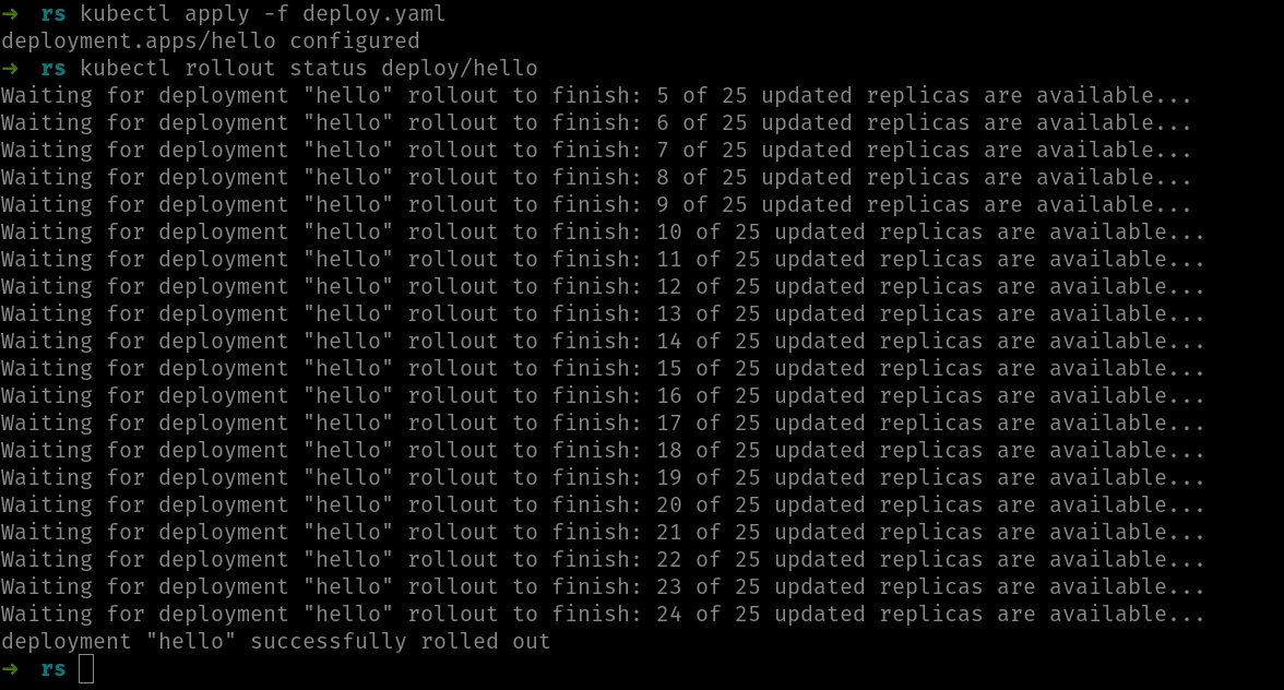 Si tienes un rolling update en marcha (es decir, deployment está sustituyendo pods viejos por los nuevos), puedes ver el estado usando kubectl rollout status. Este comando se queda a la espera de que rolling update finalice y va mostrando los pasos. Por ejemplo, en este caso, hemos escalado un deployment llamado hello de 5 a 25 réplicas y justo después del apply hemos ejecutado rollout status: