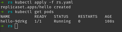 Eso significa que ReplicaSet se ha creado. En nuestro caso el valor de spec.replicas era 1, indicando que queríamos un pod. ¿Tenemos ese pod? Puedes ver los pods con kubectl get pods: