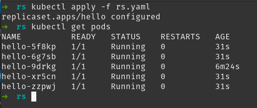Después de ejecutar ese comando, podemos mirar nuestros ReplicaSets y la salida es parecida a: