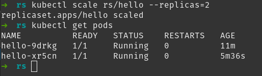 Escalar un ReplicaSet es tan sencillo como modificar spec.replicas del fichero YAML al valor deseado y luego usar otra vez el comando kubectl apply.