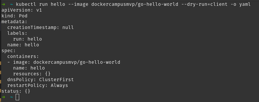kubectl run hello --image dockercampusmvp/go-hello-world --dry-run=client -o yaml > pod.yaml