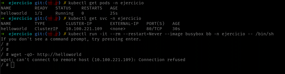 kubectl apply -f ejercicio.yaml. Eso te creará el namespaceejercicio, el pod y el servicio.