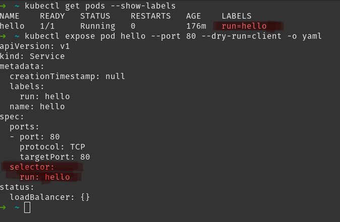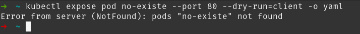 Mientras que, si el pod existe, entonces el comando te dará el YAML correcto. Eso es genial porque, por ejemplo, en el caso de los servicios, el fichero ya tendrá el selector correcto: