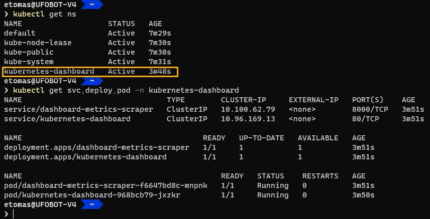 Estos comandos te habrán creado el namespace kubernetes-dashboard en el cual se ejecuta este (no te preocupes si no entiendes alguno de los conceptos de la captura siguiente, ya los irás viendo):