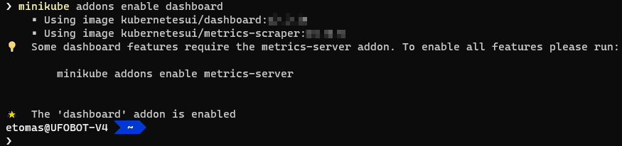 Pero si usas minikube estás de suerte, porque dashboard está disponible como un addon de minikube, lo que significa que puedes instalarlo simplemente con el comando minikube addons enable dashboard: