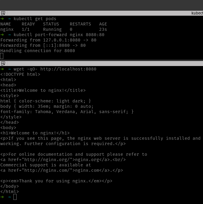 Este comando bloquea tu terminal (porque kubectl debe crear el túnel TCP) y podrás acceder al pod usando localhost:<puerto-local>: