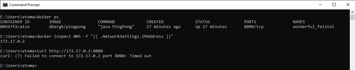 La verdad es que cada contenedor recibe una IP propia dentro de la red privada que monta Docker. Siempre podemos acceder al contenedor usando dicha IP y el puerto que abre el contenedor (en el ejemplo de la imagen dbergk/pingpong era el 8080).