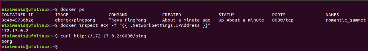 CONTAINER ID IMAGE COMMAND CREATED STATUS PORTS NAMES 5685b0f533fb dbergk/pingpong "java PingPong" 2 minutes ago Up 16 minutes 8080/tcp inspiring_wing c00ff9389dcc dbergk/pingpong "java PingPong" 2 minutes ago Up 18 minutes 8080/tcp clever_ardinghelli