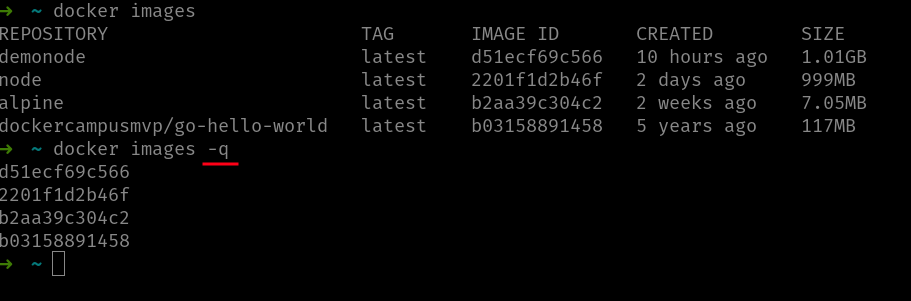 Este comando tiene dos modificadores interesantes. El primero es -q (o --quiet) que hace que tan solo nos muestre los ids de las imágenes, sin ninguna otra información y el segundo es -f (o --filter) que nos permite filtrar las imágenes a listar mediante algún criterio soportado (ver documentación para conocer cuáles son).