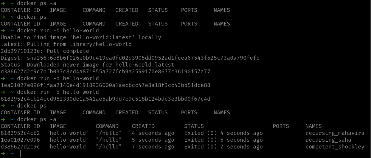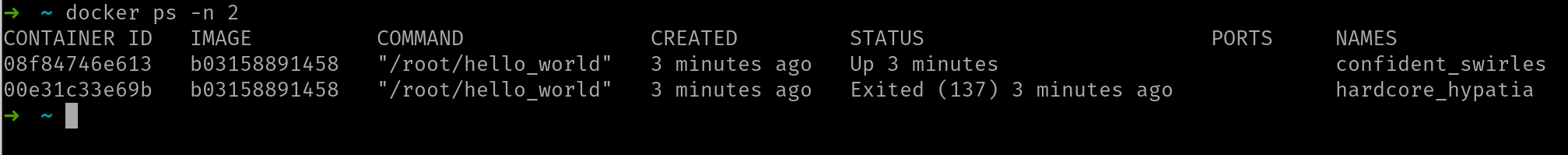 CONTAINER ID IMAGE COMMAND CREATED STATUS PORTS NAMES bee553f522b6 hello-world "/hello" 2 minutes ago Exited (0) 2 minutes ago happy_lumiere 65839cd1422c hello-world "/hello" 2 minutes ago Exited (0) 2 minutes ago awesome_wing 57f700469b93 hello-world "/hello" 2 minutes ago Exited (0) 2 minutes ago reverent_sammet