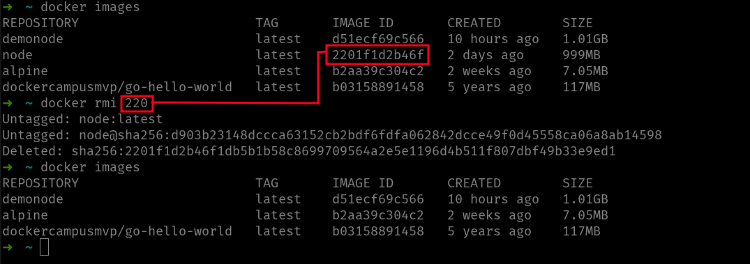 La realidad es que, en este caso, el comando rmi no borra la imagen sino que simplemente “le quita el nombre”. De hecho, si miras la imagen anterior verás que en la salida del comando rmi, Docker responde con Untagged que significa “desetiquetado”. En este caso Docker nos dice que ha eliminado el nombre dockercampusmvp/go-hello-world. Pero la imagen en nuestro disco continua estando:
