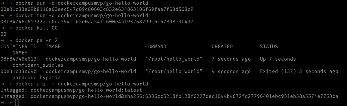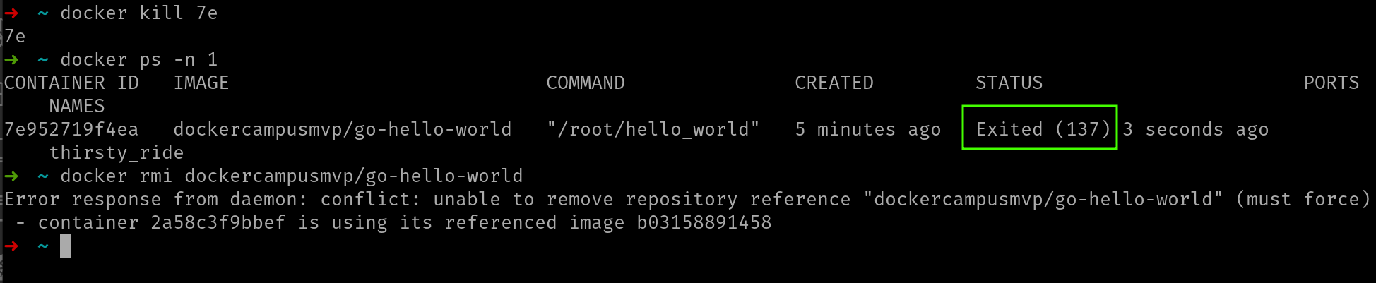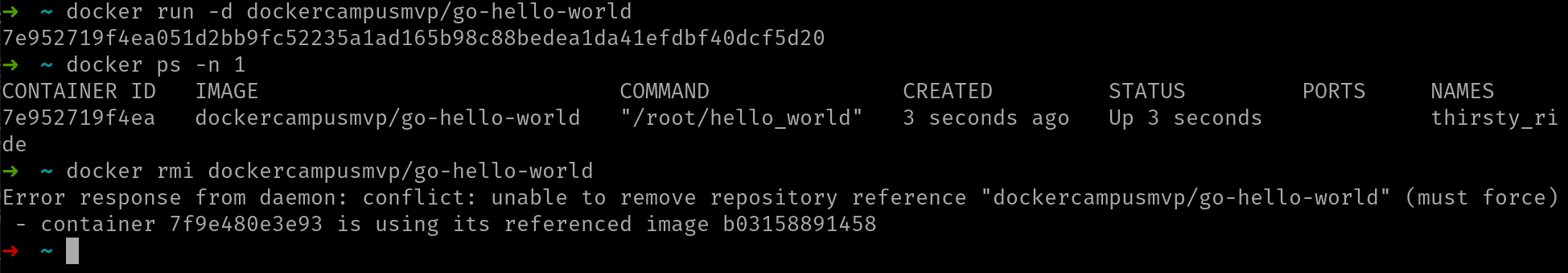 En la imagen se ve cómo se crea un contenedor (usando docker run) y luego se intenta usar docker rmi para borrar la imagen dockercampusmvp/go-hello-world que se ha usado para crear el contenedor. Dado que existe un contenedor que está usando la imagen, docker rmi da error.