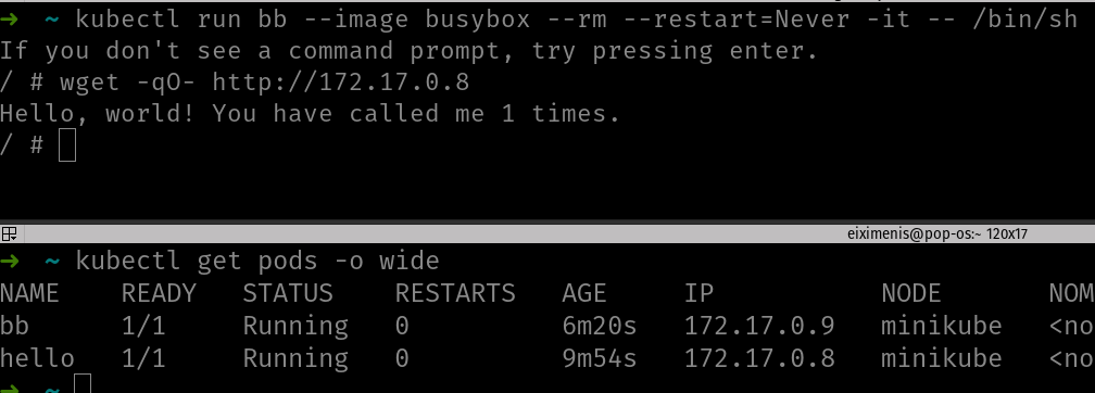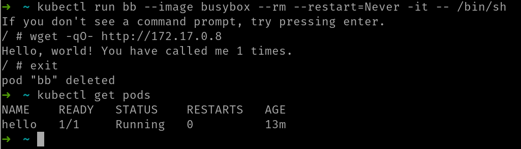Ahora tu terminal, es el terminal de busybox, que se está ejecutando como un pod dentro del clúster. Si tecleas wget -qO- http://<ip-del-pod-hello> en este terminal, el pod hello te debería responder: