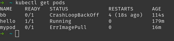 En la imagen anterior puedes ver como tenemos un pod llamado bb que está en CrashLoopBackOff. Además Kubernetes nos informa del número de veces que ha reiniciado el contenedor (4 en nuestro ejemplo) y del tiempo del último reinicio (18 segundos).
