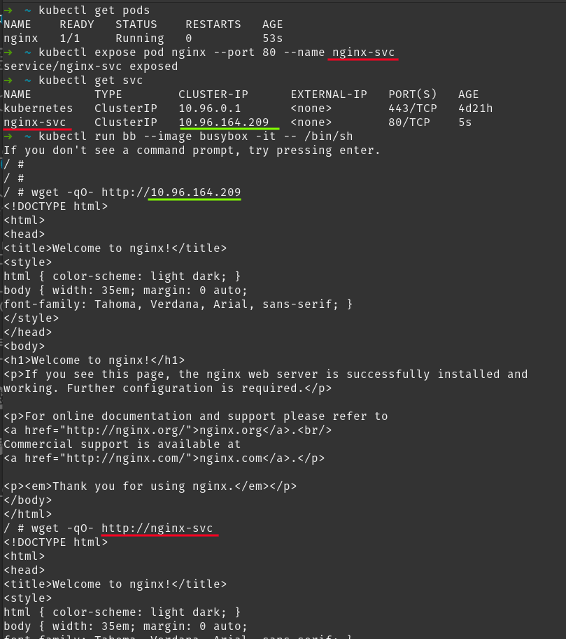 Esto lo puedes comprobar viendo cuál es la IP del servicio. Para ello usa el comando kubectl get services (puedes usar la abreviatura svc):
