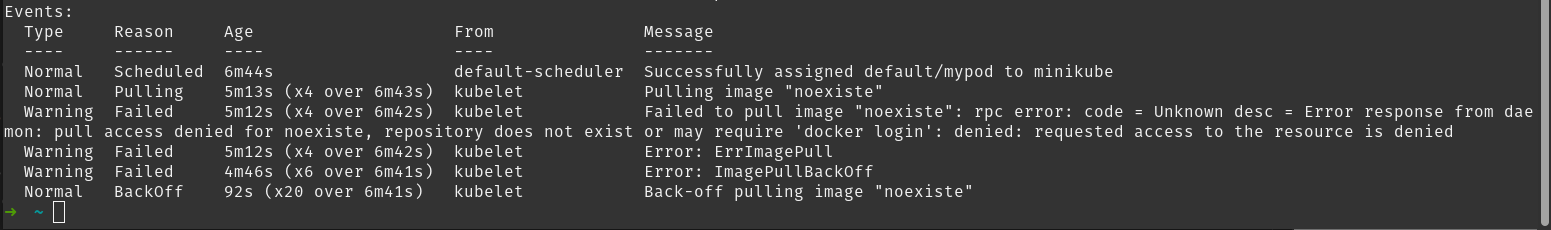 Successfully assigned default/mypod to minikube: el planificador indica que ha seleccionado un nodo para el podPulling image “noexiste”: el kubelet informa de que empieza a obtener la imagennoexisteFailed to pull image “noexiste”: el kubelet informa de un error al obtener la imagennoexisteError: ErrImagePull: el pod entra en estadoErrImagePullError: ImagePullBackOffError: el pod entra en estadoImagePullBackOffBack-off pulling image “noexiste”: el kubelet se está esperando hasta intentar obtener la imagen de nuevo