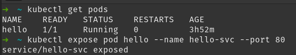 En la imagen puedes ver cómo se usa kubectl expose para crear un servicio llamado hello-svc. Este servicio expone el pod hello, lo que significa que todas las llamadas al servicio serán redirigidas al pod.