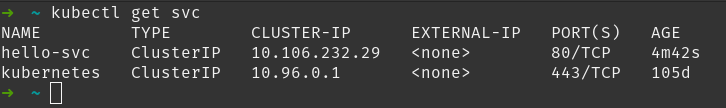 El servicio hello-svc tiene la IP 10.96.0.1. Esta IP es interna del clúster (no accesible desde fuera) y se conoce con el nombre de ClusterIP.