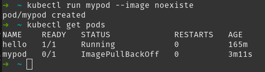 Observa la imagen siguiente: puedes ver como se intenta crear un pod con una imagen llamada noexiste (que no existe en realidad). El comando kubectl run funciona correctamente, y Kubernetes indica que el pod ha sido creado. Pero, como hemos comentado, ¡eso no significa que el contenedor esté corriendo! Si luego ejecutamos un kubectl get pods podremos ver el error: