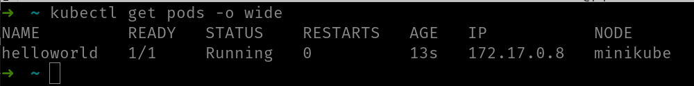 NAME READY STATUS RESTARTS AGE IP NODE hello 1/1 Running 0 8s 172.17.0.8 minikube