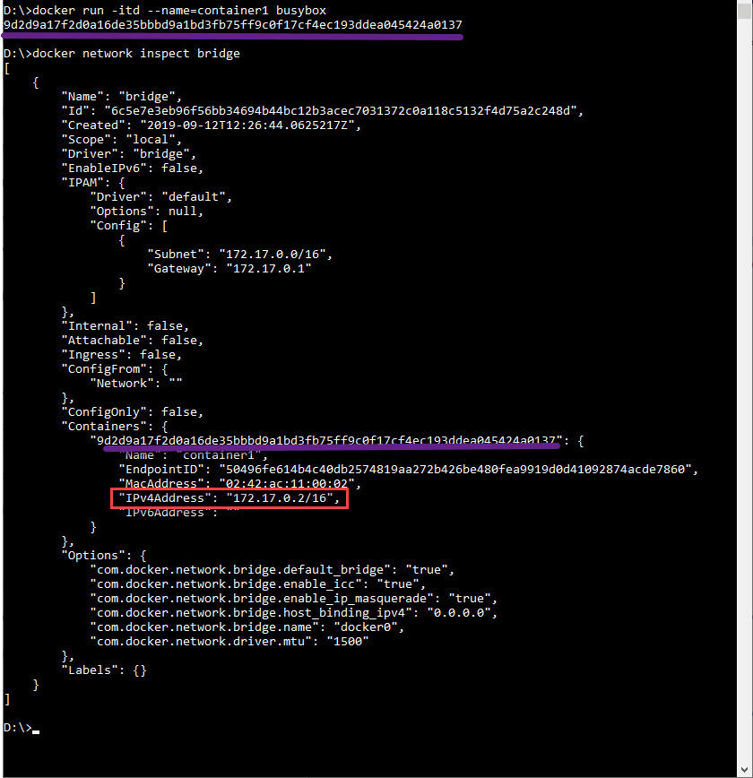 Cuando ejecutas un contenedor con docker run dicho contenedor se asocia por defecto a la red llamada bridge (de tipo bridge):