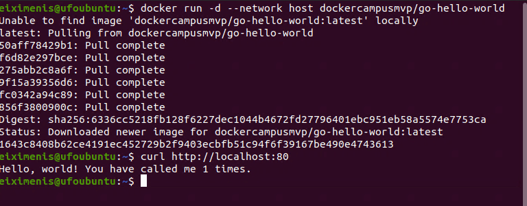 Como puedes ver en la imagen anterior, se puede acceder al contenedor directamente usando http://localhost:80, ya que este no tiene IP propia y se ejecuta en la misma red y espacio de puertos que el host. Observa que no hay redirección de puertos (no se usa el parámetro -p de docker run). De hecho, el puerto 80 del host está ahora ocupado por el propio contenedor: