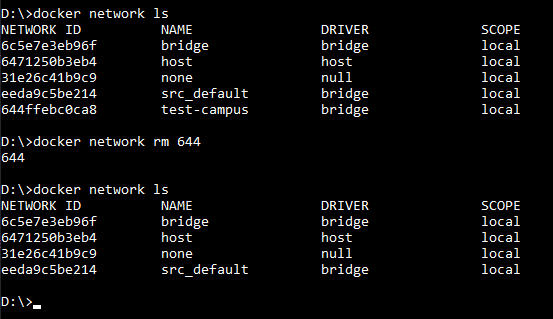 El comando docker network es el encargado de manejar las redes de Docker. Ya has visto el comando docker network create para crear redes. Análogamente existe el comando docker network rm para eliminar una red. Su sintaxis es docker network rm <id>: