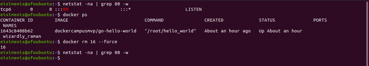 En la imagen se puede observar como el puerto 80 del host está abierto mientras el contenedor se está ejecutando y se libera al detener el contenedor.