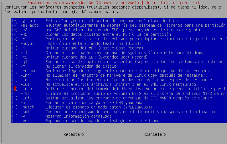 Si creemos que los datos pueden entrar, vamos por el modo Expert y elegimos la opción icds. Con esto nos saltaremos la comprobación de tamaño del disco de destino.