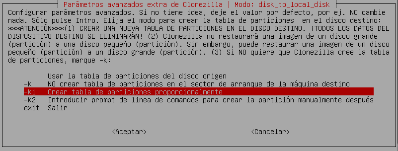 En la siguiente pantalla también es necesario elegir la opción k1: crear tabla de particiones proporcionalmente.