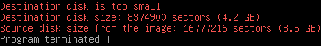 Ahí vemos que estamos intentando clonar un disco de 8,5 GB en otro de 4,2 GB.