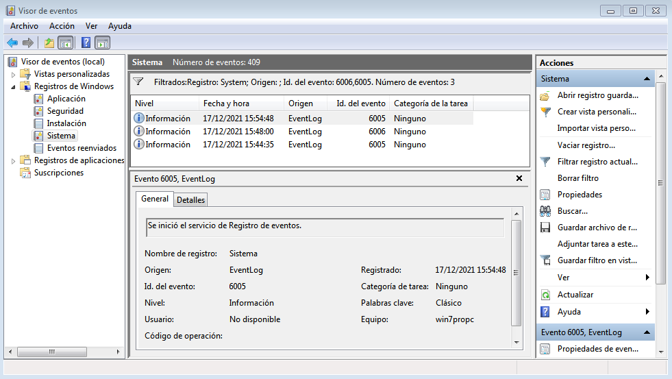 Utilizando el Visor de eventos, podemos buscar por el inicio del servicio de Registro de eventos (id 6005) o su finalización (id 6006). Abrimos el Visor de Eventos y en el panel lateral izquierdo seleccionamos Registros de Windows → Sistema. En el panel lateral derecho, pulsamos sobre Filtrar registro actual y en el campo donde nos permite indicar el identificador de eventos escribimos 6005,6006. AL pulsar en Aceptar veremos los registros correspondientes. Al pulsar por alguno con el ID 6005 veremos la fecha en que se registró el evento que podemos usarla como fecha de inicio del equipo.