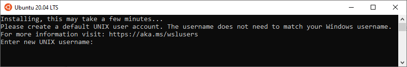 Una vez hayas habilitado WSL e instalado una distribución de Linux de Microsoft Store, el primer paso que debes completar al abrir la distribución recién instalada de Linux es crear una cuenta, incluido un nombre de usuario y una contraseña: