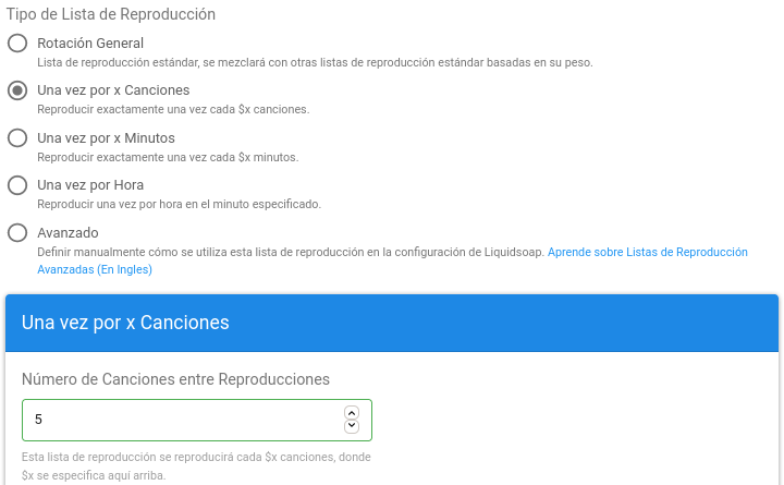Si queremos que cierto audio se reproduzca en medio de la retransmisión normal, tenemos que crear una lista de reproducción de un tipo diferente según queramos que se reproduzca cada x tiempo, x canciones o a una determinada hora: