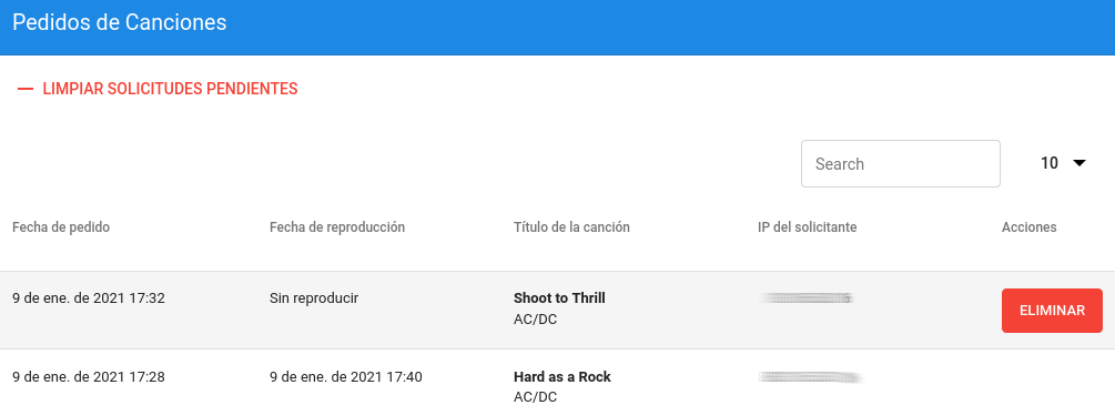 Pulsando en Solicitar se enviará la petición y podemos verla en el panel de administración de la estación (Informes → Pedidos de canciones):