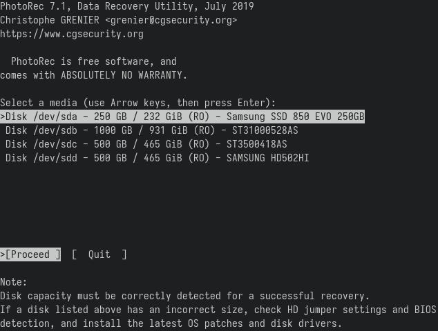 Al lanzar PhotoRec nos mostará una lista de medios detectados para elegir desde cuál queremos recuperar archivos: